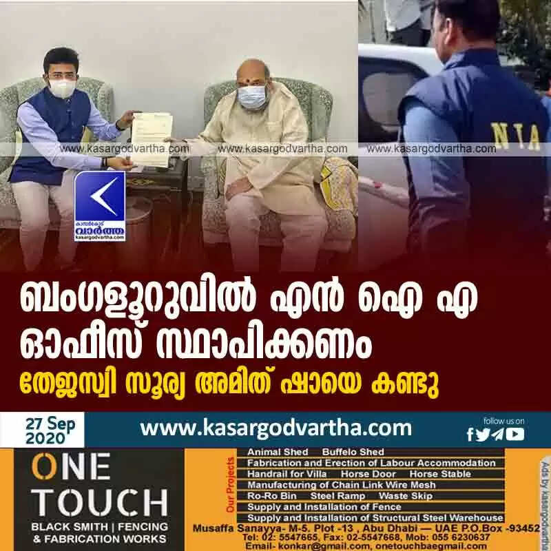 ബംഗളൂറുവില്‍ എന്‍ ഐ എ ഓഫീസ് സ്ഥാപിക്കണം തേജസ്വി സൂര്യ അമിത് ഷായെ കണ്ടു