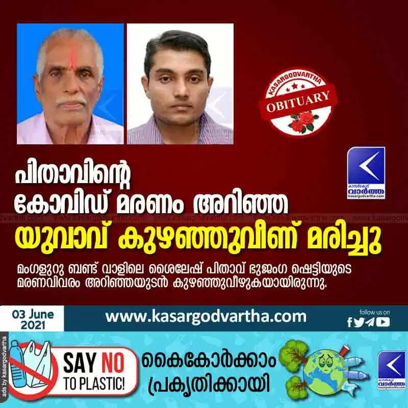 മംഗളുറു: (www.kasargodvartha.com 03.06.2021) പിതാവ് കോവിഡ് ബാധിതനായി മരണമടഞ്ഞതിനു പിന്നാലെ മകൻ കുഴഞ്ഞുവീണ് മരിച്ചു. മംഗളുറു ബണ്ട് വാളിലെ ശൈലേഷ് (44) പിതാവ് ഭുജംഗ ഷെട്ടിയുടെ (85) മരണവിവരം അറിഞ്ഞയുടൻ കുഴഞ്ഞുവീഴുകയായിരുന്നു.