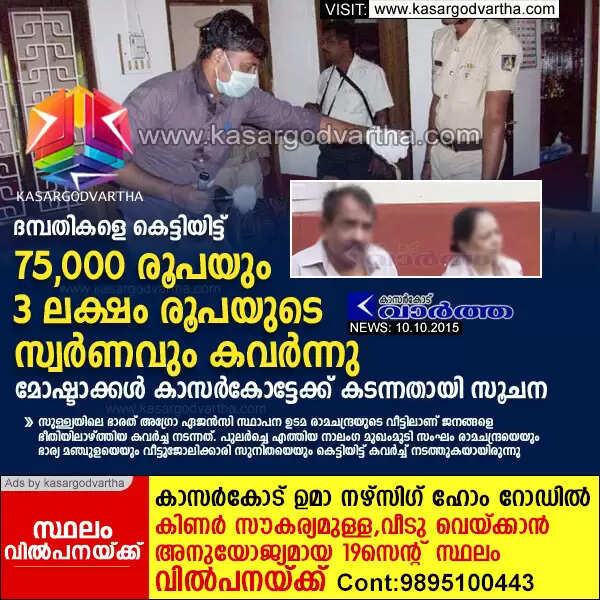 സുള്ള്യ: (www.kasargodvartha.com 10/10/2015) ദമ്പതികളെ കെട്ടിയിട്ട് 75,000 രൂപയും മൂന്നു ലക്ഷം രൂപയുടെ സ്വര്ണവും കവര്ന്നു. സുള്ള്യ കണ്ഠമംഗലയില് ശനിയാഴ്ച പുലര്ച്ചെ 2.30 മണിയോടെയാണ് സംഭവം. സുള്ള്യയിലെ ഭാരത് അഗ്രോ ഏജന്സി സ്ഥാപന ഉടമ രാമചന്ദ്രയുടെ വീട്ടിലാണ് ജനങ്ങളെ ഭീതിയിലാഴ്ത്തിയ കവര്ച്ച നടന്നത്. പുലര്ച്ചെ എത്തിയ നാലംഗ മുഖംമൂടി സംഘം രാമചന്ദ്രയെയും ഭാര്യ മഞ്ചുളയെയും വീട്ടുജോലിക്കാരി സുനിതയെയും കെട്ടിയിട്ട് കവര്ച്ച് നടത്തുകയായിരുന്നു.
