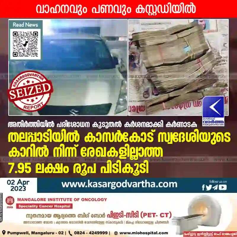 Cash seized | അതിര്ത്തിയില് പരിശോധന കൂടുതല് കര്ശനമാക്കി കര്ണാടക; തലപ്പാടിയില് കാസര്കോട് സ്വദേശിയുടെ കാറില് നിന്ന് രേഖകളില്ലാത്ത 7.95 ലക്ഷം രൂപ പിടികൂടി