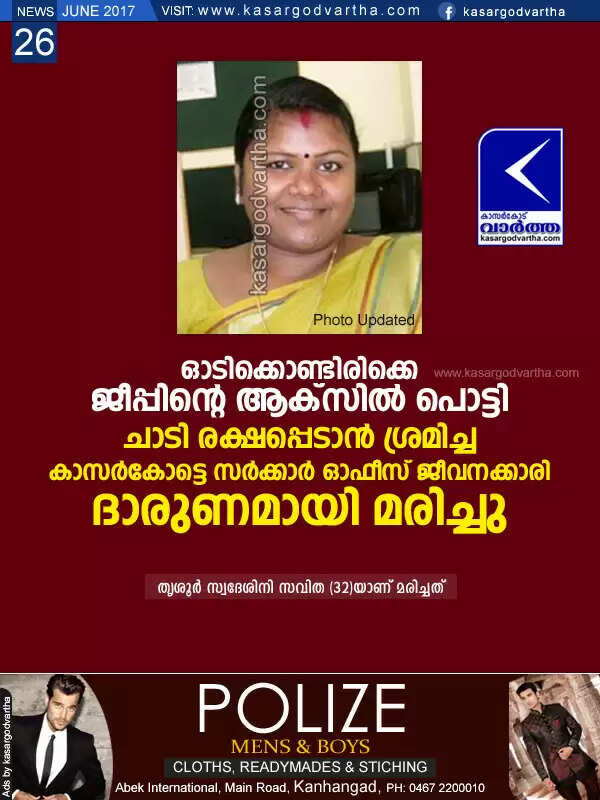ഓടിക്കൊണ്ടിരിക്കെ ജീപ്പിന്റെ ആക്സില് പൊട്ടി; ചാടി രക്ഷപ്പെടാന് ശ്രമിച്ച കാസര്കോട്ടെ സര്ക്കാര് ഓഫീസ് ജീവനക്കാരി ദാരുണമായി മരിച്ചു