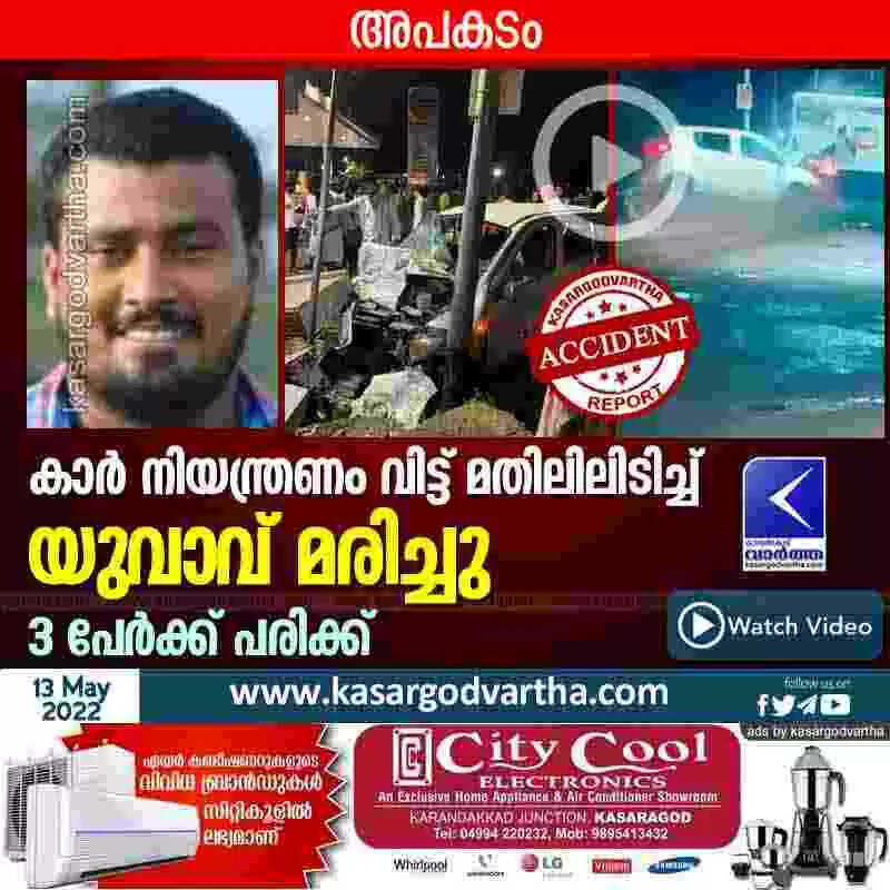 Accident Death | കാർ നിയന്ത്രണം വിട്ട് മതിലിലിടിച്ച് യുവാവ് മരിച്ചു; 3 പേർക്ക് പരിക്ക്