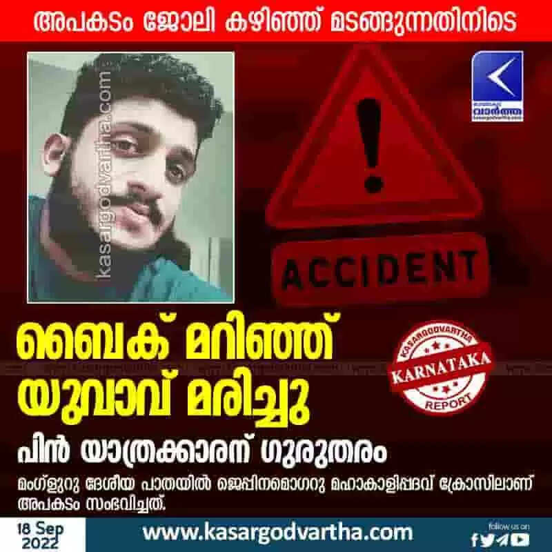 Young man died | ബൈക് മറിഞ്ഞ് യുവാവ് മരിച്ചു; പിന് യാത്രക്കാരന് ഗുരുതരം