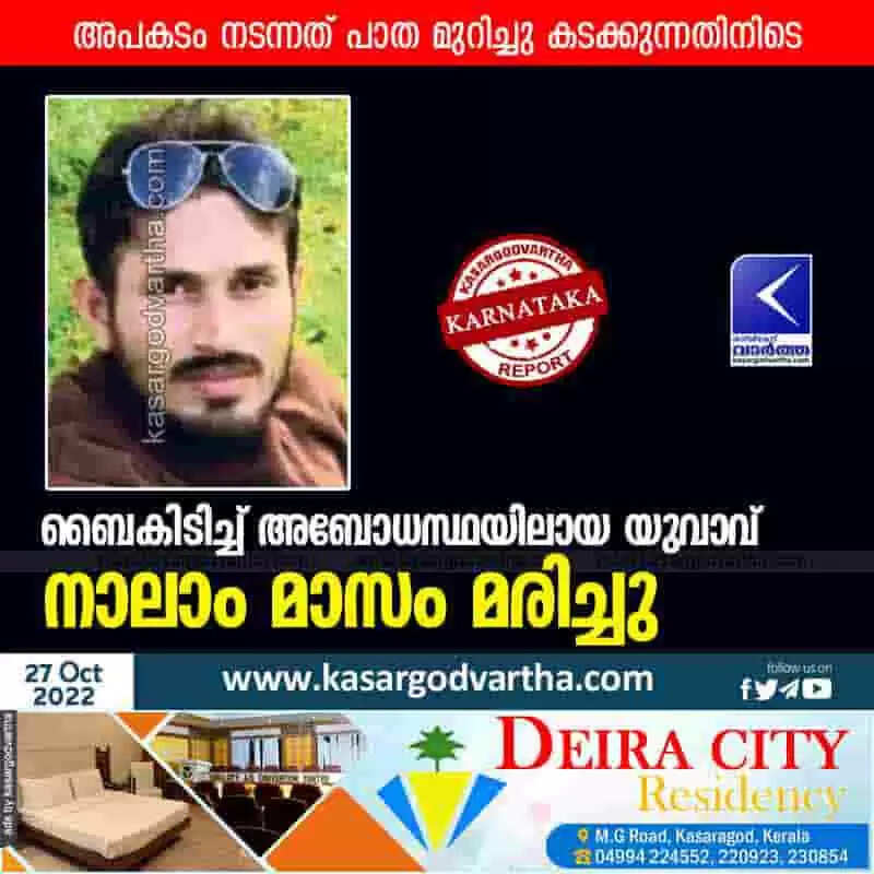 കുടുംബത്തോടൊപ്പം കേരളത്തിലെ തീർഥാടന കേന്ദ്രങ്ങൾ സന്ദർശിച്ച് മടങ്ങുന്നതിനിടെ കഴിഞ്ഞ ജൂൺ നാലിനാണ് യുവാവ് അപകടത്തിൽ പെട്ടത്. ഭാര്യയേയും രണ്ട് മക്കളേയും കാറിൽ ഇരുത്തി സാധനം വാങ്ങാൻ പാത മുറിച്ചു കടക്കുന്നതിനിടെ അതിവേഗം വന്ന ബൈക് ഇടിക്കുകയായിരുന്നു. ഗുരുതരമായി പരുക്കേറ്റ് മംഗ്ളൂറിലെ ആശുപത്രിയിൽ ചികിത്സ തുടർന്നെങ്കിലും ബോധം തെളിയാതെയാണ് മരണം സംഭവിച്ചത്.