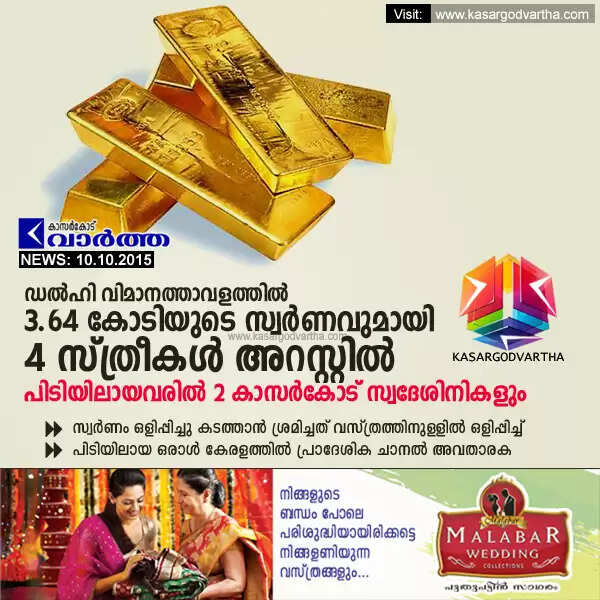 ഡല്ഹി വിമാനത്താവളത്തില് 3.64 കോടിയുടെ സ്വര്ണവുമായി 4 സ്ത്രീകള് അറസ്റ്റില്; പിടിയിലായവരില് 2 കാസര്കോട് സ്വദേശിനികളും