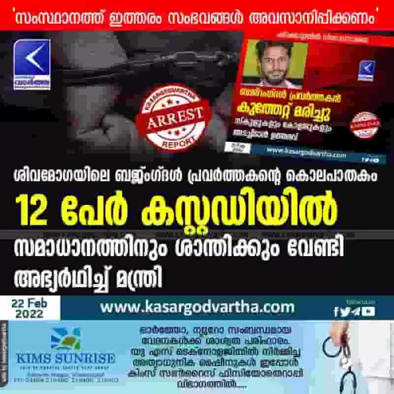 ശിവമോഗയിലെ ബജ്റംഗ്ദള് പ്രവര്ത്തകന്റെ കൊലപാതകം: 12 പേര് കസ്റ്റഡിയില്; സമാധാനത്തിനും ശാന്തിക്കും വേണ്ടി അഭ്യര്ഥിച്ച് മന്ത്രി