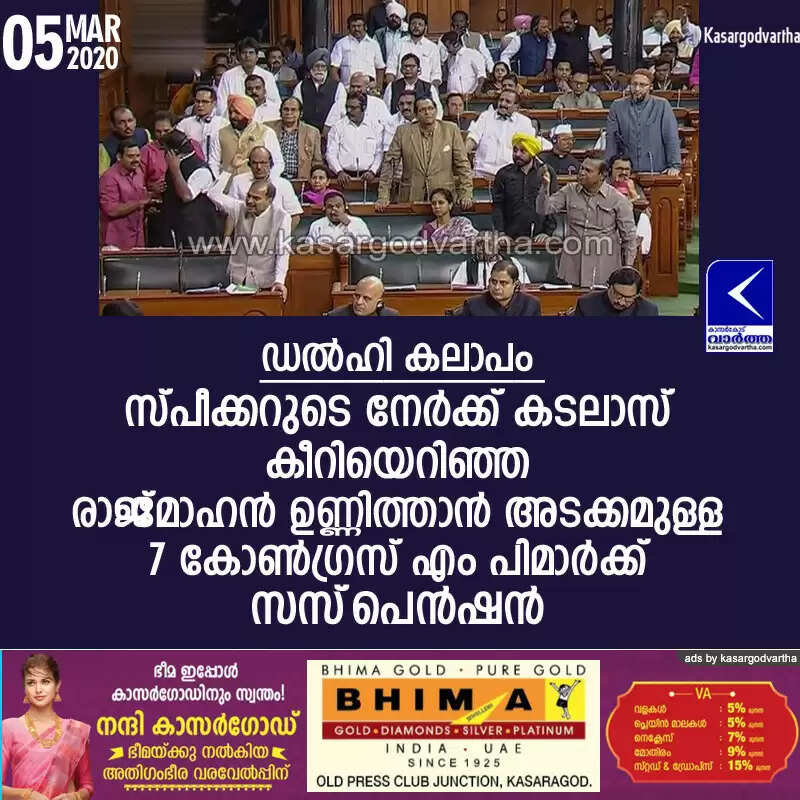 ഡല്ഹി കലാപം; സ്പീക്കറുടെ നേര്ക്ക് കടലാസ് കീറിയെറിഞ്ഞ രാജ്മോഹന് ഉണ്ണിത്താന് അടക്കമുള്ള 7 കോണ്ഗ്രസ് എം പിമാര്ക്ക് സസ്പെന്ഷന്