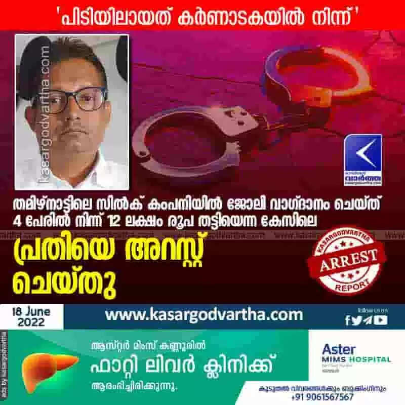 Arrested | തമിഴ്നാട്ടിലെ സില്ക് കംപനിയില് ജോലി വാഗ്ദാനം ചെയ്ത് 4 പേരില് നിന്ന് 12 ലക്ഷം രൂപ തട്ടിയെന്ന കേസിലെ പ്രതിയെ അറസ്റ്റ് ചെയ്തു