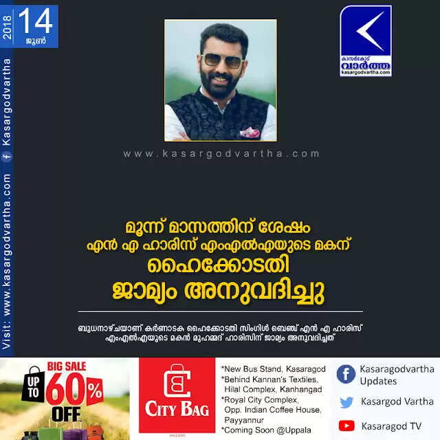 ബംഗളൂരു: (www.kasargodvartha.com 14.06.2018) ബംഗളൂരു ശാന്തിനഗര് എംഎല്എ എന് എ ഹാരിസിന്റെ മകന് മൂന്ന് മാസത്തിന് ശേഷം ഹൈക്കോടതി ജാമ്യം അനുവദിച്ചു. ബുധനാഴ്ചയാണ് കര്ണാടക ഹൈക്കോടതി സിംഗിള് ബെഞ്ച് എന് എ ഹാരിസ് എംഎല്എയുടെ മകന് മുഹമ്മദ് ഹാരിസിന് ജാമ്യം അനുവദിച്ചത്. ബംഗളൂരുവിലെ ആഡംബര ഹോട്ടലില് വ്യവസായിയുടെ മകനെ മര്ദിച്ച കേസില് മൂന്ന് മാസമായി ജയിലില്കഴിയുകയായിരുന്നു മുഹമ്മദ് ഹാരിസ്.