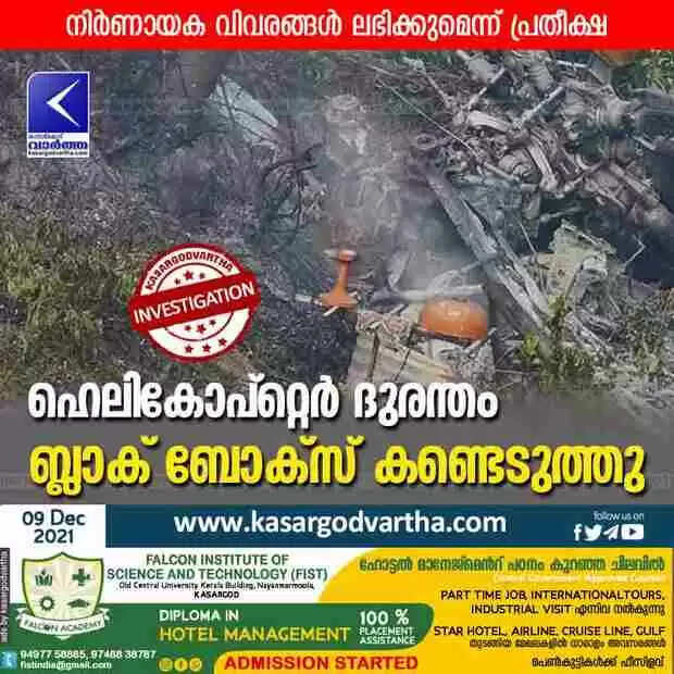 ന്യൂഡൽഹി: (www.kasaragodvartha.com 09.12.2021) തമിഴ്നാട്ടിലെ കൂനൂരിൽ ചീഫ് ഓഫ് ഡിഫൻസ് സ്റ്റാഫ് ജനറൽ ബിപിൻ റാവതും ഭാര്യ മധുലിക റാവതും ഉൾപെടെ 13 പേർ മരിച്ച ഇൻഡ്യൻ എയർഫോഴ്സിന്റെ ഹെലികോപ്റ്റെറിന്റെ ബ്ലാക് ബോക്സ് വ്യാഴാഴ്ച അന്വേഷണ ഉദ്യോഗസ്ഥർ കണ്ടെടുത്തു. ഫ്ലൈറ്റ് റെകോർഡർ എന്നും അറിയപ്പെടുന്ന ബ്ലാക് ബോക്സ് ദാരുണമായ അപകടത്തിന് മുമ്പുള്ള അവസാന മിനിറ്റുകളുടെ നിർണായക വിവരങ്ങൾ നൽകുമെന്നാണ് പ്രതീക്ഷിക്കുന്നത്.