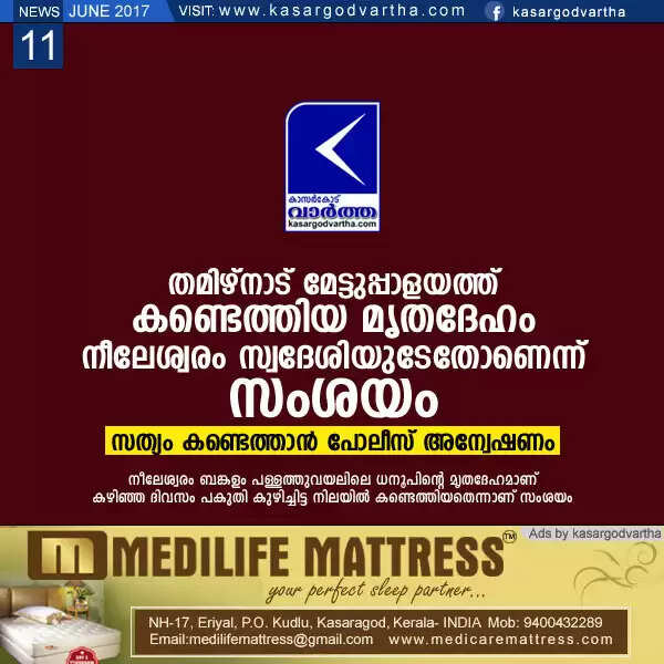 തമിഴ്നാട് മേട്ടുപ്പാളയത്ത് കണ്ടെത്തിയ മൃതദേഹം നീലേശ്വരം സ്വദേശിയുടേതോണെന്ന് സംശയം; സത്യം കണ്ടെത്താന് പോലീസ് അന്വേഷണം