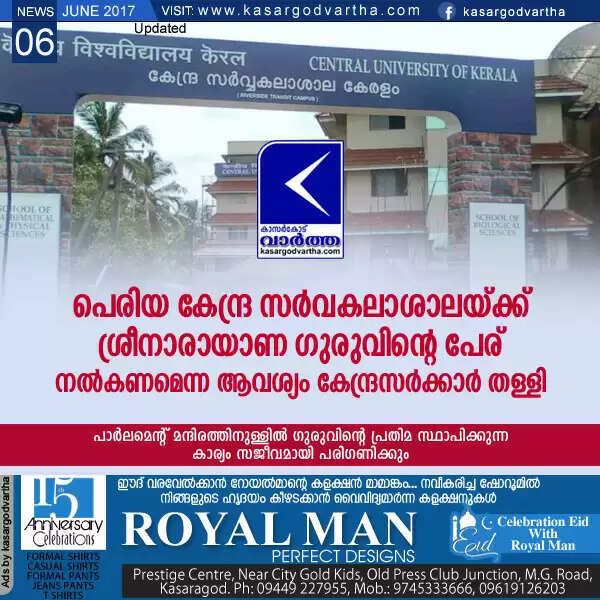 പെരിയ കേന്ദ്ര സര്വകലാശാലയ്ക്ക് ശ്രീനാരായാണ ഗുരുവിന്റെ പേര് നല്കണമെന്ന ആവശ്യം കേന്ദ്രസര്ക്കാര് തള്ളി