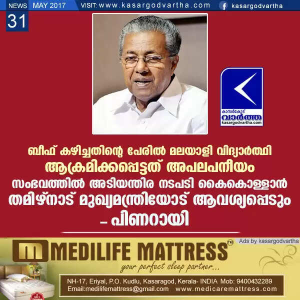 ബീഫ് കഴിച്ചതിന്റെ പേരില് മലയാളി വിദ്യാര്ത്ഥി ആക്രമിക്കപ്പെട്ടത് അപലപനീയം; സംഭവത്തില് അടിയന്തിര നടപടി കൈകൊള്ളാന് തമിഴ്നാട് മുഖ്യമന്ത്രിയോട് ആവശ്യപ്പെടും: പിണറായി