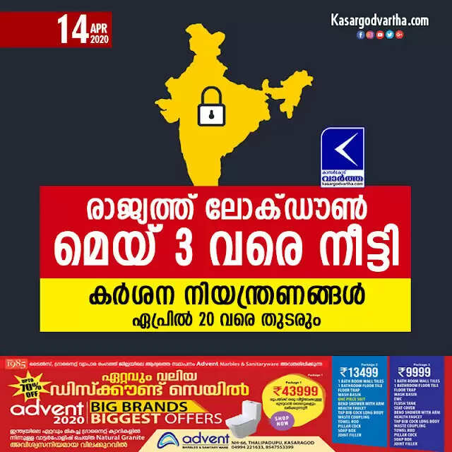 രാജ്യത്ത് ലോക്ഡൗണ് മെയ് 3 വരെ നീട്ടി; കര്ശന നിയന്ത്രണങ്ങള് ഏപ്രില് 20 വരെ തുടരും
