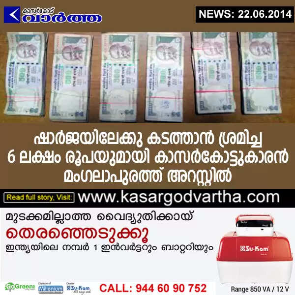 ഷാര്ജയിലേക്കു കടത്താന് ശ്രമിച്ച 6 ലക്ഷം രൂപയുമായി കാസര്കോട്ടുകാരന് മംഗലാപുരത്ത് അറസ്റ്റില്