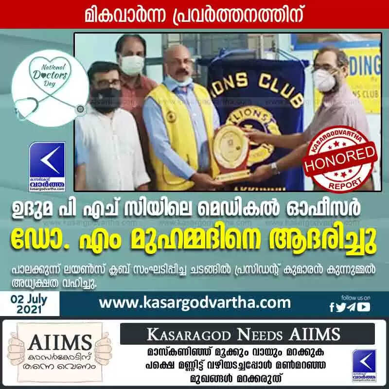 പാലക്കുന്ന്: ആതുര ശുശ്രൂഷ രംഗത്ത് മികച്ച പ്രവർത്തനം കാഴ്ച വെക്കുന്ന ഡോ. എം മുഹമ്മദിനെ ഡോക്ടേർസ് ദിനത്തിൽ പാലക്കുന്ന് ലയൺസ് ക്ലബ് ആദരിച്ചു. ഉദുമ കുടുംബാരോഗ്യ കേന്ദ്രത്തിലെ മെഡികൽ ഓഫീസർ ആയ അദ്ദേഹം ജനങ്ങളുടെ ഏറെ പ്രിയപ്പെട്ട മുഖമാണ്.