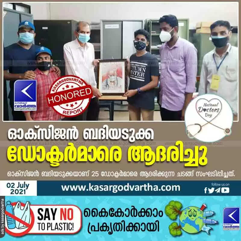 ബദിയടുക്ക: ഡോക്ടേർസ് ദിനത്തിൽ ബദിയടുക്കയിലെ 25 ഡോക്ടർമാർരെ 'ഓക്സിജൻ ബദിയടുക്ക' ആദരിച്ചു. കോവിഡ് മഹാമാരിക്കാലത്ത് അർപണ ബോധവും കാരുണ്യവും കൊണ്ട് കാവലേകുന്ന ഡോക്ടർമാർക്ക് മധുര പലഹാരങ്ങളും സ്നേഹപത്രവും പൂക്കളും നൽകിയാണ് ഓക്സിജൻ ഭാരവാഹികൾ ഐക്യദാർഢ്യവുമായെത്തിയത്.