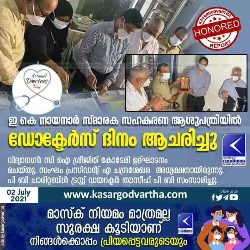 ചെങ്കള: ഇ കെ നായനാർ സ്മാരക സഹകരണ ആശുപത്രിയിൽ ഡോക്ടേർസ് ദിനം ആചരിച്ചു. പരിപാടി വിദ്യാനഗർ സി ഐ ശ്രീജിത് കോടേരി ഉദ്ഘാടനം ചെയ്തു. സംഘം പ്രസിഡന്റ് എ ചന്ദ്രശേഖര അധ്യക്ഷനായിരുന്നു. പി ബി ചാരിറ്റബിൾ ട്രസ്റ്റ് ഡയറക്ടർ തൗസീഫ് പി ബി സംസാരിച്ചു. മാനജർ പ്രദീപ് കെ സ്വാഗതവും, നഴ്സിംഗ് സൂപ്രണ്ട് മുംതാസ് റഹീം നന്ദിയും പറഞ്ഞു.