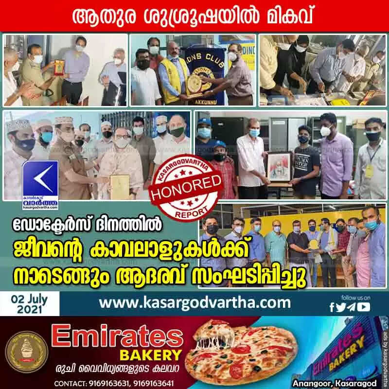 കാസർകോട്: (www.kasargodvartha.com 02.07.2021) ദേശീയ ഡോക്ടേർസ് ദിനത്തിന്റെ ഭാഗമായി ജീവന്റെ കാവലാളുകൾ എന്ന് വിശേഷിപ്പിക്കപ്പെടുന്ന ഡോക്ടർമാരെ നാടെങ്ങും വിവിധ സംഘടനകളുടെ ആഭിമുഖ്യത്തിൽ ആദരിച്ചു.