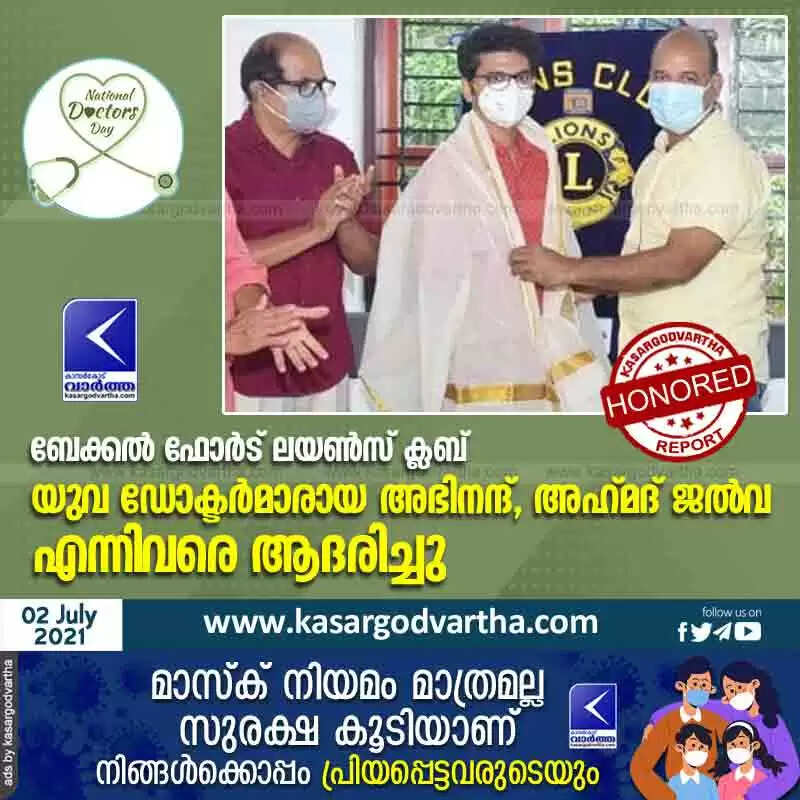ബേക്കൽ ഫോർട് ലയൺസ് ക്ലബ് യുവ ഡോക്ടർമാരെ ആദരിച്ചു