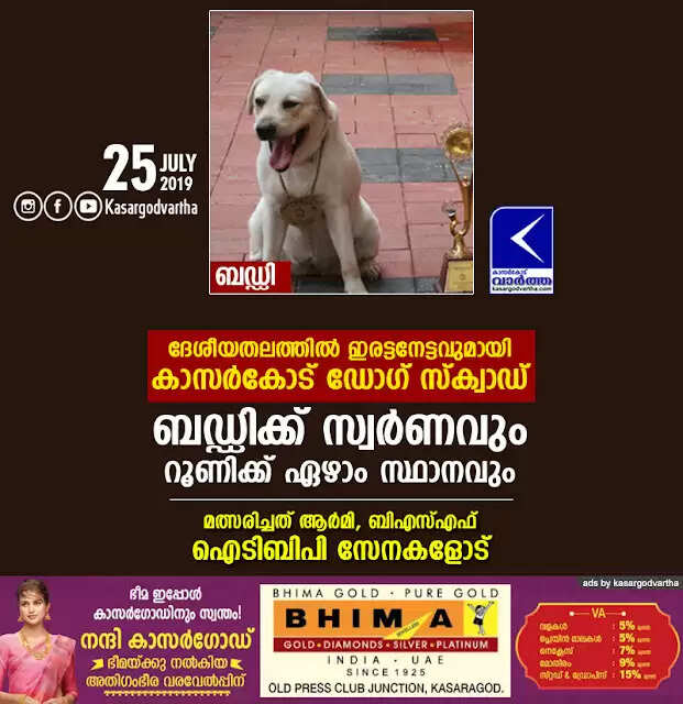 ദേശീയതലത്തില്‍ ഇരട്ടനേട്ടവുമായി കാസര്‍കോട് ഡോഗ് സ്‌ക്വാഡ്; ബഡ്ഡിക്ക് സ്വര്‍ണവും റൂണിക്ക് ഏഴാം സ്ഥാനവും; മത്സരിച്ചത് ആര്‍മി, ബിഎസ്എഫ്, ഐടിബിപി സേനകളോട്