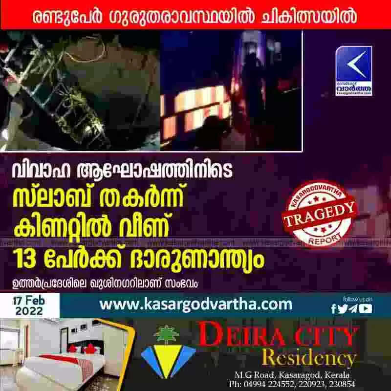 ലക്നൗ: (www.kasargodvartha.com 17.02.2022) ഉത്തര്പ്രദേശിലെ ഖുശിനഗര് ജില്ലയില് വിവാഹാഘോഷത്തിനിടെ സ്ലാബ് തകര്ന്ന് കിണറ്റില് വീണ് സ്ത്രീകളും കുട്ടികളും ഉള്പെടെ 13 പേര് മരിച്ച സംഭവത്തില് കുടുംബത്തിന് നാല് ലക്ഷം രൂപ വീതം നഷ്ടപരിഹാരം നല്കുമെന്ന് ജില്ലാ മജിസ്ട്രേറ്റ് അറിയിച്ചു.