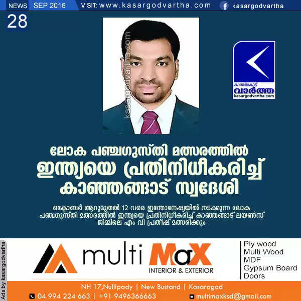 ലോക പഞ്ചഗുസ്തി മത്സരത്തില് ഇന്ത്യയെ പ്രതിനിധീകരിച്ച് കാഞ്ഞങ്ങാട് സ്വദേശി