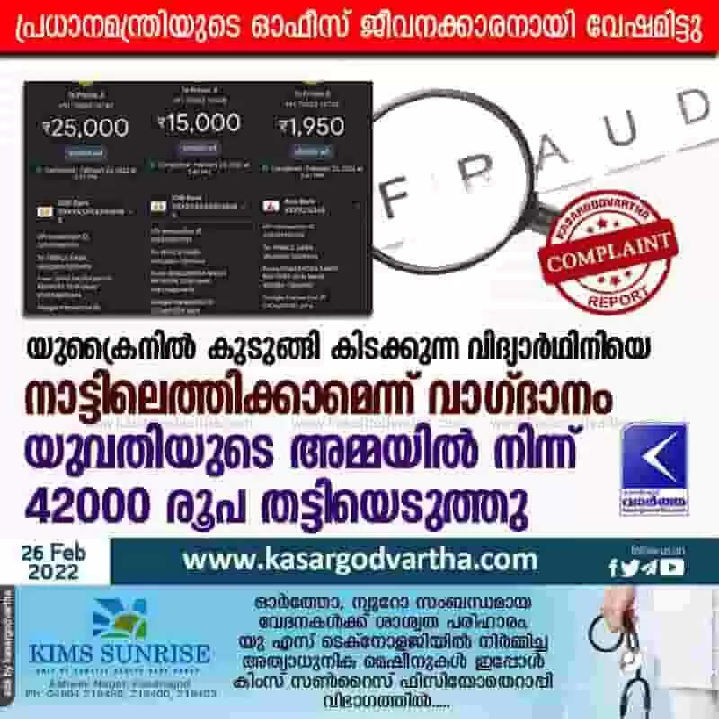 'യുക്രൈനിൽ കുടുങ്ങി കിടക്കുന്ന വിദ്യാർഥിനിയെ നാട്ടിലെത്തിക്കാമെന്ന് വാഗ്ദാനം; പ്രധാനമന്ത്രിയുടെ ഓഫീസ് ജീവനക്കാരനായി വേഷമിട്ടു; യുവതിയുടെ അമ്മയിൽ നിന്ന് 42000 രൂപ തട്ടിയെടുത്തു'