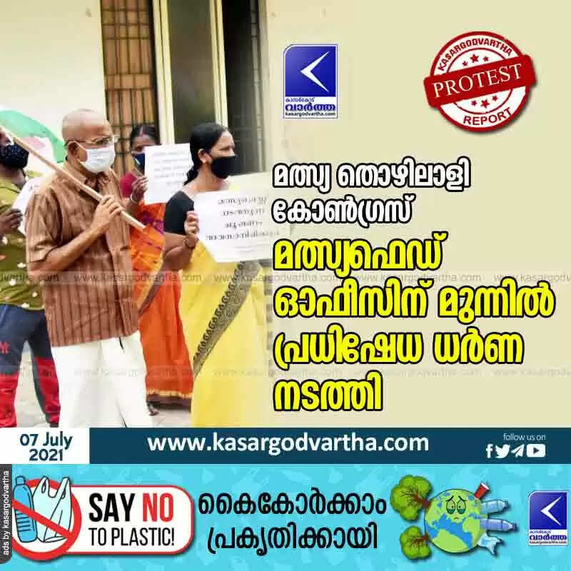 Keywords: Kasaragod, Kerala, News, Protest, Fishermen, Congress, Development project, National, Secretary, Inauguration, President, Matsya thozhilali congress held protest in front of Matsyafed office.