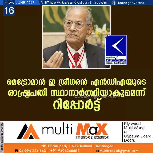 ന്യൂഡല്ഹി: (www.kasargodvartha.com 16.06.2017) എന്ഡിഎയുടെ രാഷ്ട്രപതി സ്ഥാനാര്ഥിയാകാന് മെട്രോമാന് ഇ ശ്രീധരനെ പരിഗണിക്കുന്നുവെന്ന് റിപ്പോര്ട്ടുകള്. ദേശീയ മാധ്യമമായ ഇന്ത്യ ടുഡെയാണ് ഇതു സംബന്ധിച്ച് ആദ്യം വാര്ത്ത പുറത്തുവിട്ടത്. പിന്നീട് മറ്റു ദേശീയ മാധ്യമങ്ങളും ഇതുസംബന്ധിച്ച് വാര്ത്ത നല്കി.