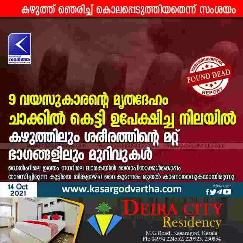 ന്യൂഡെല്ഹി: (www.kasargodvartha.com 14.10.2021) ഒമ്പത് വയസുകാരന്റെ മൃതദേഹം ചാക്കില് കെട്ടി ഉപേക്ഷിച്ച നിലയില് കണ്ടെത്തി. ഉത്തം നഗറിലെ ദ്വാരകയില് മാതാപിതാക്കള്കൊപ്പം താമസിച്ചിരുന്ന കുട്ടിയെ തിങ്കളാഴ്ച വൈകുന്നേരം മുതല് കാണാതായതിനാല് വീട്ടുകാര് പൊലീസില് പരാതി നല്കി. തുടര്ന്ന് നടത്തിയ അന്വേഷണത്തിലാണ് ബുധനാഴ്ച ഉച്ചയോടെ കുട്ടിയുടെ മൃതദേഹം വീടിന് പരിസരത്തുള്ള മറ്റൊരു വീട്ടില് നിന്നും ചാക്കില് കെട്ടിയ നിലയില് കണ്ടെത്തിയത്.
