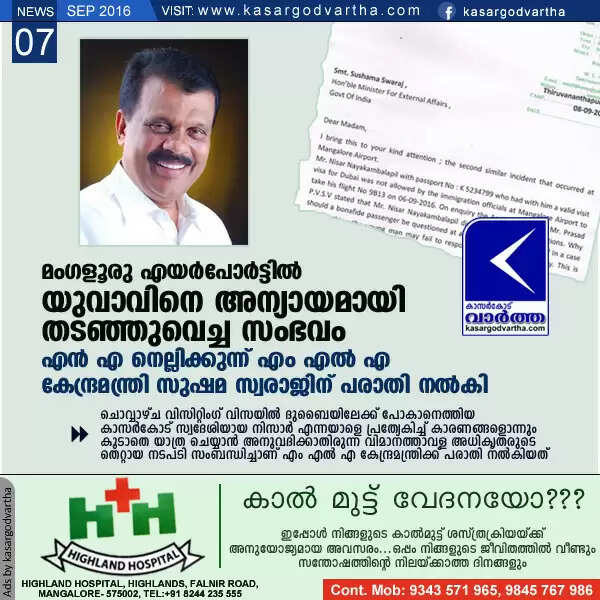 Keywords : Complaint, Airport, N.A.Nellikunnu, MLA, National, Minister, Youth, Kasaragod, Nisar, Sushma Swaraj, Mangalore Airport, MLA's complaint against Airport.