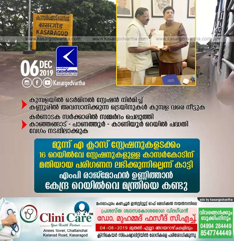 കുമ്പളയില് ടെര്മിനല് സ്റ്റേഷന് നിര്മിച്ച് കണ്ണൂരില് അവസാനിക്കുന്ന ട്രെയിനുകള് കുമ്പള വരെ നീട്ടുക, കര്ണാടക സര്ക്കാരില് സമ്മര്ദം ചെലുത്തി കാഞ്ഞങ്ങാട് - പാണത്തൂര് - കാണിയൂര് റെയില് പദ്ധതി വേഗം നടപ്പിലാക്കുക; മൂന്ന് എ ക്ലാസ് സ്റ്റേഷനുകളടക്കം 16 റെയില്വേ സ്റ്റേഷനുകളുള്ള കാസര്കോടിന് മതിയായ പരിഗണന ലഭിക്കുന്നില്ലെന്ന് കാട്ടി എംപി രാജ്മോഹന് ഉണ്ണിത്താന് കേന്ദ്ര റെയില്വെ മന്ത്രിയെ കണ്ടു