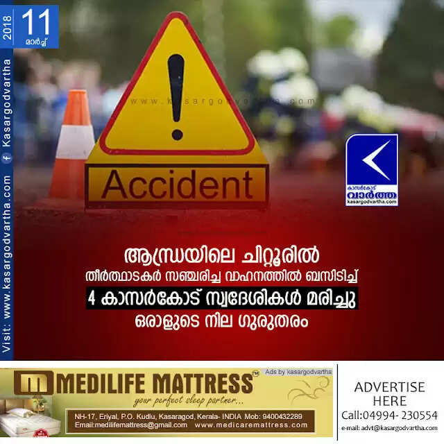 ആന്ധ്രയിലെ ചിറ്റൂരില്‍ തീര്‍ത്ഥാടകര്‍ സഞ്ചരിച്ച വാഹനത്തില്‍ ബസിടിച്ച് 4 കാസര്‍കോട് സ്വദേശികള്‍ മരിച്ചു, ഒരാളുടെ നില ഗുരുതരം