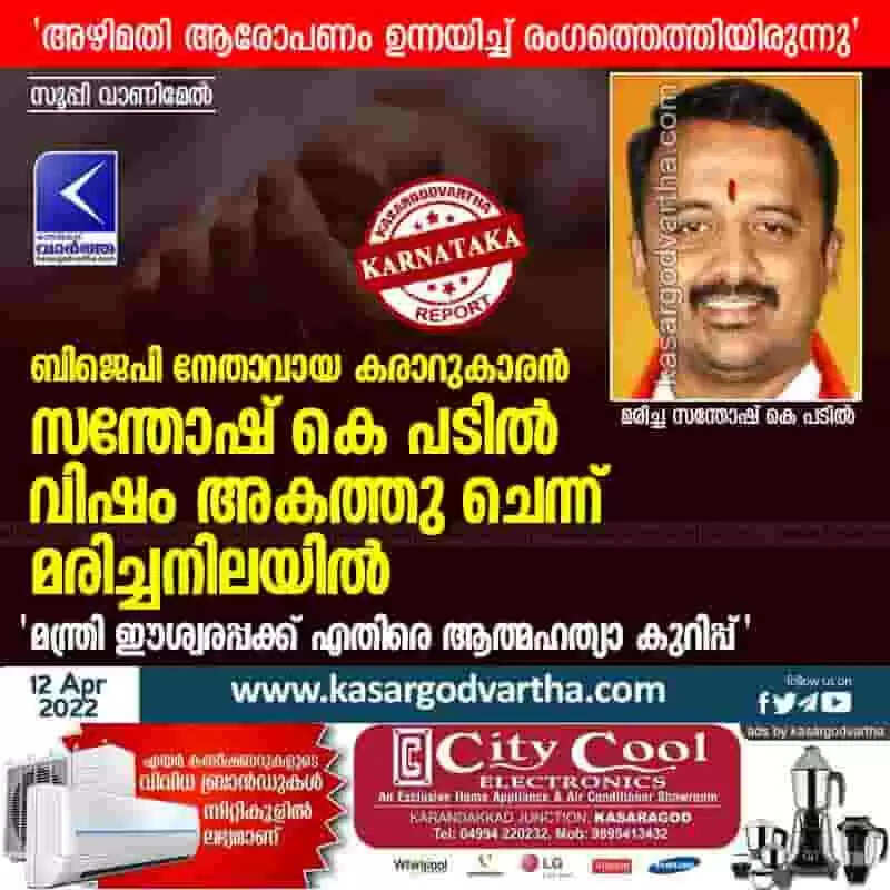 ബിജെപി നേതാവായ കരാറുകാരൻ സന്തോഷ് കെ പടിൽ വിഷം അകത്തു ചെന്ന് മരിച്ചനിലയിൽ; 'മന്ത്രി ഈശ്വരപ്പക്ക് എതിരെ ആത്മഹത്യാ കുറിപ്പ്'