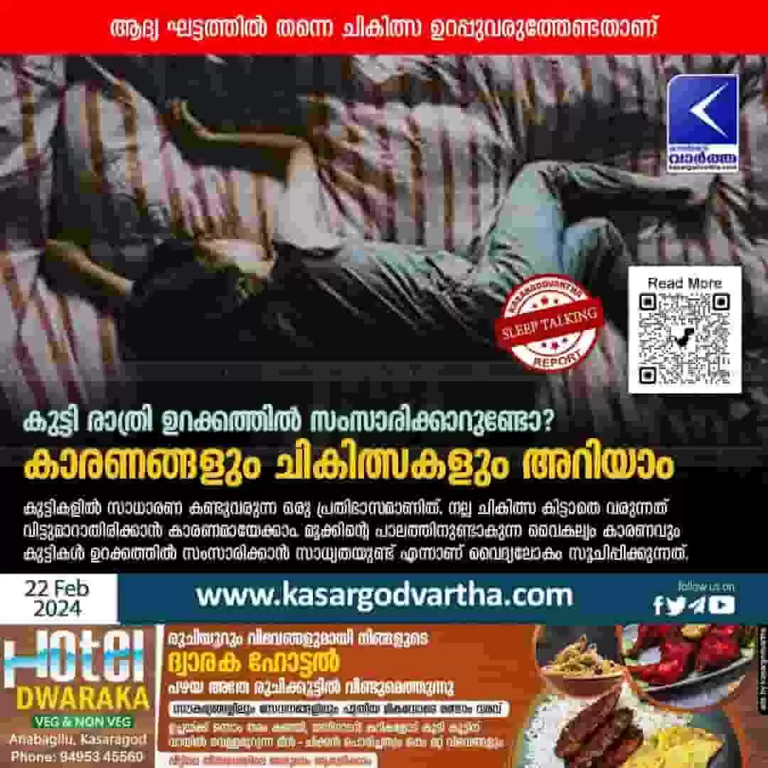 ന്യൂഡെൽഹി: (KasargodVartha) നിങ്ങളുടെ കുട്ടികൾ രാത്രി ഉറങ്ങുന്ന സമയത്തു സംസാരിക്കുന്നത് നിങ്ങളുടെ ശ്രദ്ധയിൽ പെട്ടിട്ടുണ്ടോ? ചില കുട്ടികൾ വലുതാകും വരെ ഇതൊരു ശീലമായി മാറിയിരിക്കുന്നു. ശരിയായ കരണങ്ങളോ നല്ല ചികിത്സയോ കിട്ടാതെ വരുന്നതും ഇത് വിട്ട് മാറാതിരിക്കാൻ കാരണമായേക്കാം. കുട്ടികളില് സാധാരണ കണ്ടുവരുന്ന ഒരു പ്രതിഭാസമാണിത്. മൂക്കിന്റെ പാലത്തിനുണ്ടാകുന്ന വൈകല്യം (Deviated nasal septum) കാരണവും കുട്ടികള് ഉറക്കത്തില് സംസാരിക്കാന് സാധ്യതയുണ്ട് എന്നാണ് വൈദ്യലോകം സൂചിപ്പിക്കുന്നത്.