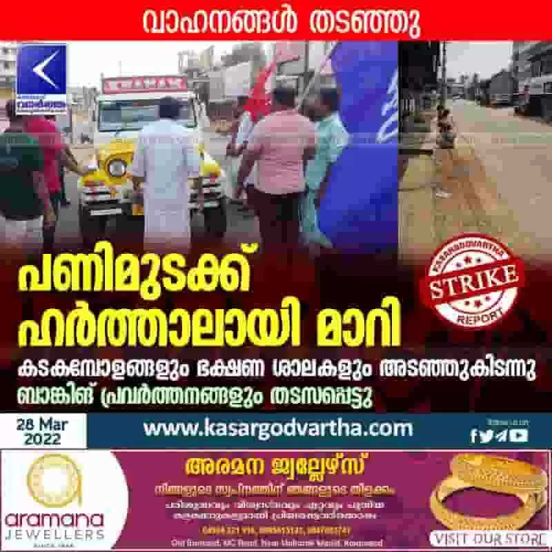 കാസർകോട്: (www.kasargodvartha.com 28.03.2022) വിവിധ ട്രേഡ് യൂനിയനുകൾ ആഹ്വാനം ചെയ്ത രാജ്യവ്യാപക പൊതുപണിമുടക്ക് ഹർത്താലായി മാറി. വിവിധ പ്രദേശങ്ങളിലെ തിരക്കേറിയ തെരുവുകൾ ആളൊഴിഞ്ഞ രൂപത്തിലായിരുന്നു. കടകൾ പൂർണമായും അടഞ്ഞുകിടന്നു. ബസുകളും ടാക്സികളും ഓടോറിക്ഷകളും ഓടിയില്ല. കെ എസ് ആർ ടി സിയും സർവീസ് നടത്തിയില്ല.