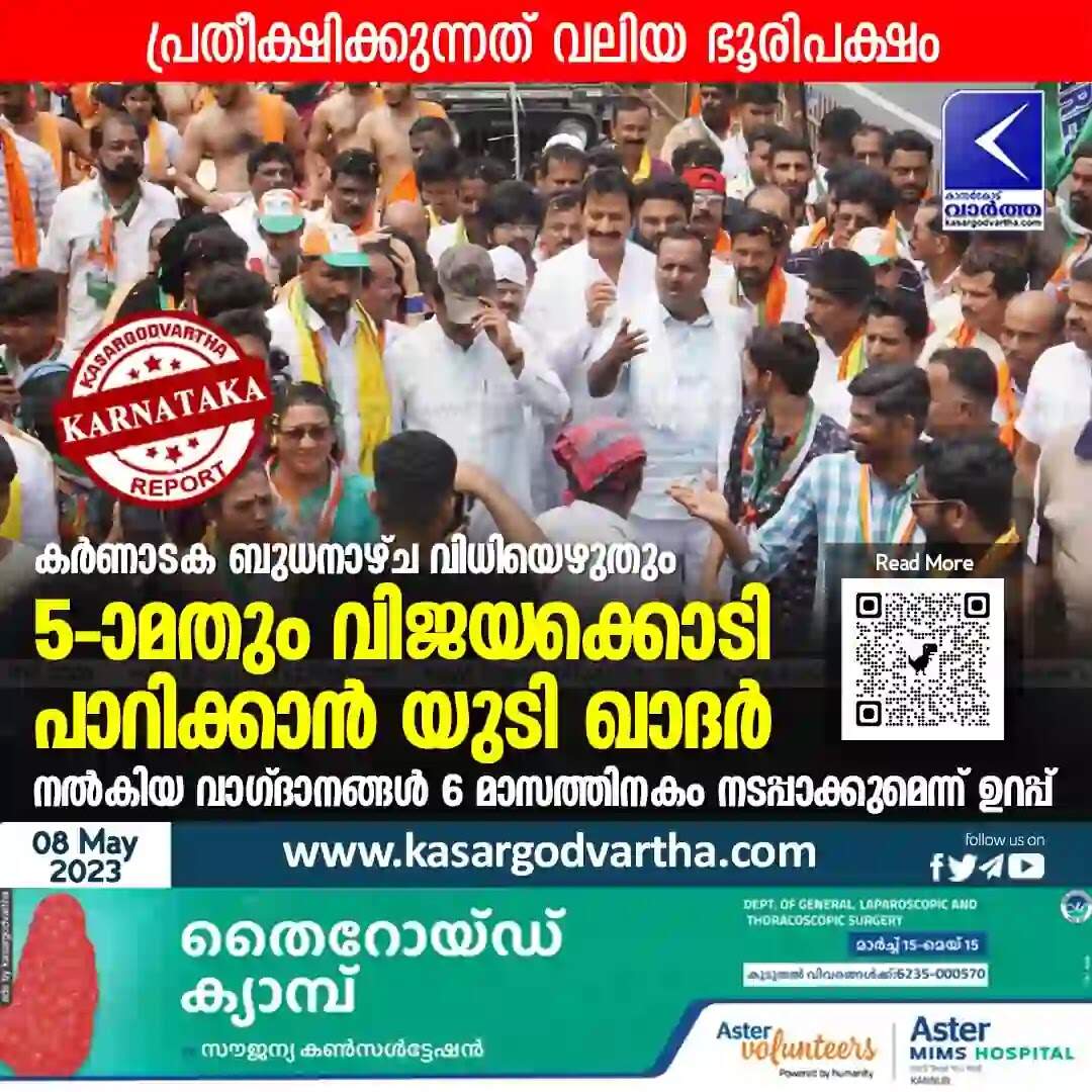 മംഗ്ളുറു: (www.kasargodvartha.com) കര്ണാടക നിയസഭാ തിരഞ്ഞെടുപ്പിന്റെ പരസ്യ പ്രചാരണം തിങ്കളാഴ്ച വൈകീട്ട് അഞ്ച് മണിക്ക് അവസാനിച്ചു. ബുധനാഴ്ച സംസ്ഥാനത്ത് ഒറ്റഘട്ടമായി വോടെടുപ്പ് നടക്കും. ദക്ഷിണ കന്നഡ ജില്ലയിലെ മംഗ്ളുറു മണ്ഡലത്തില് നിന്ന് മത്സരിക്കുന്ന കോണ്ഗ്രസ് സ്ഥാനാര്ഥിയും നിലവിലെ എംഎല്എയുമായ യുടി ഖാദര് അഞ്ചാം വിജയം തേടുകയാണ്. കൊട്ടിക്കലാശത്തിന്റെ ആവേശത്തിനിടയില് വിജയിക്കുമെന്ന ആത്മവിശ്വാസം തന്നെയാണ് യുടി ഖാദര് പങ്കുവെക്കുന്നത്.