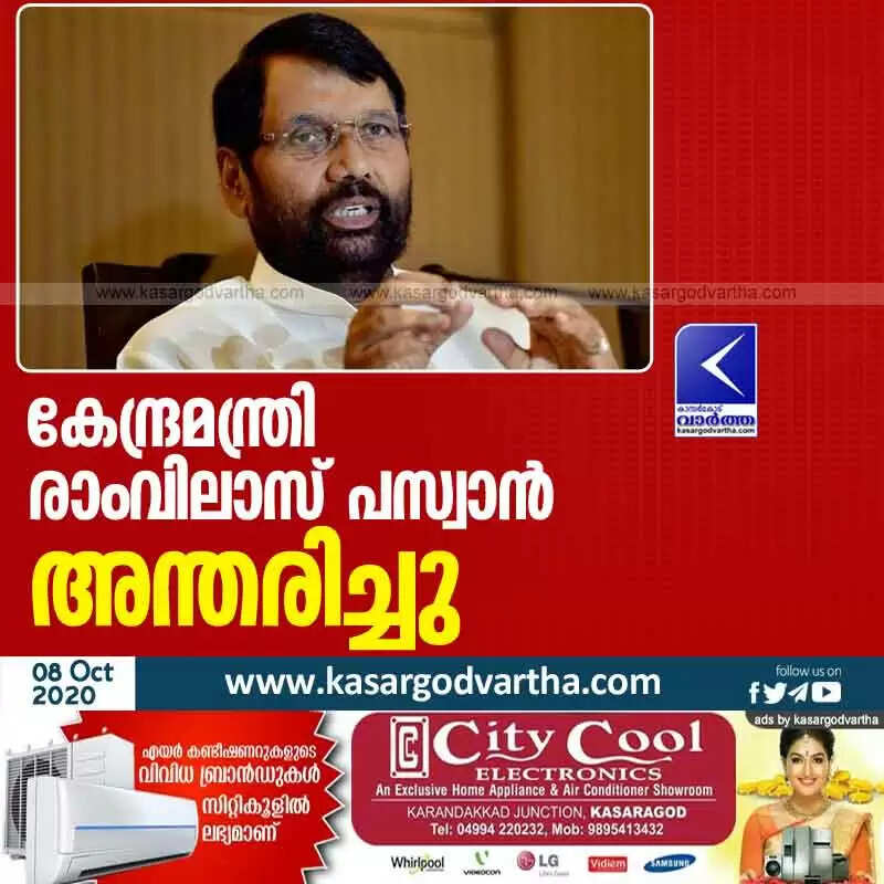 ന്യൂഡല്‍ഹി: (www.kasargodvartha.com 08.10.2020) ലോക്ജനശക്തി പാര്‍ട്ടി (എല്‍ ജെ പി) നേതാവും കേന്ദ്രമന്ത്രിയുമായ രാം വിലാസ് പസ്വാന്‍ (74 ) അന്തിരിച്ചു