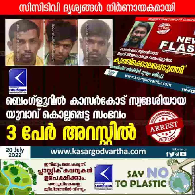 Arrested | ബെംഗ്ളൂറില് കാസര്കോട് സ്വദേശിയായ യുവാവ് കൊല്ലപ്പെട്ട സംഭവം: 3 പേര് അറസ്റ്റില്