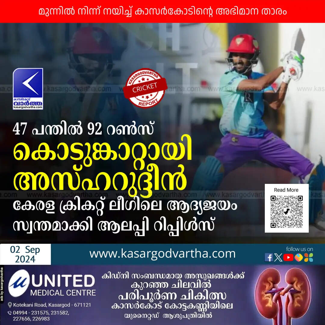 Victory | 47 പന്തിൽ 92 റൺസ്; കൊടുങ്കാറ്റായി അസ്ഹറുദ്ദീൻ; കേരള ക്രികറ്റ് ലീഗിലെ ആദ്യജയം സ്വന്തമാക്കി ആലപ്പി റിപ്പിൾസ്