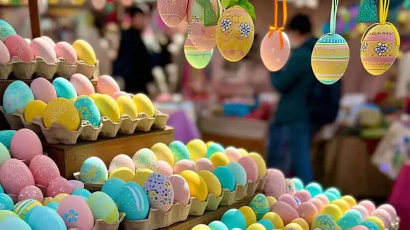Easter brings a vibrant market of colorful eggs, with red eggs symbolizing Christ's blood. The tradition originated in ancient Mesopotamia and spread globally. Children in America and Canada believe the Easter Bunny delivers them. Hollow eggs represent Christ's empty tomb.