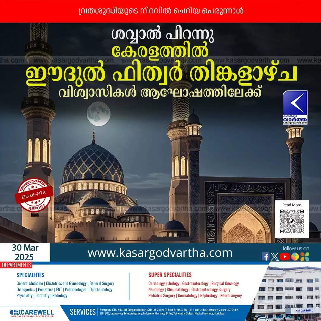 കാസർകോട്: (KasargodVartha) റമദാൻ മാസത്തിലെ വ്രതാനുഷ്ഠാനങ്ങൾക്ക് വിരാമമിട്ട് ശവ്വാൽ മാസപ്പിറവി ദൃശ്യമായതിനെ തുടർന്ന് കേരളത്തിൽ ഈദുൽ ഫിത്വർ (ചെറിയ പെരുന്നാൾ) തിങ്കളാഴ്ചയായിരിക്കുമെന്ന് വിവിധ ഖാദിമാരായ പാണക്കാട് സയ്യിദ് സ്വാദിഖ് അലി ശിഹാബ് തങ്ങൾ, സയ്യിദ് മുഹമ്മദ് ജിഫ്രി മുത്തുക്കോയ തങ്ങൾ, കാന്തപുരം എ പി അബൂബക്കർ മുസ്ലിയാർ, സയ്യിദ് ഇബ്റാഹീമുൽ ഖലീൽ അൽ ബുഖാരി, പ്രൊഫ. ആലിക്കുട്ടി മുസ്ലിയാർക്ക് വേണ്ടി മജീദ് ബാഖവി, സയ്യിദ് മുഹമ്മദ് കോയ തങ്ങൾ ജമലുല്ലൈലി, സയ്യിദ് നാസർ ഹയ്യ് ശിഹാബ് തങ്ങൾ, തൊടിയൂർ മുഹമ്മദ് കുഞ്ഞ് മൗലവി, വിപി സുഹൈബ് മൗലവി തുടങ്ങിയവർ അറിയിച്ചു.