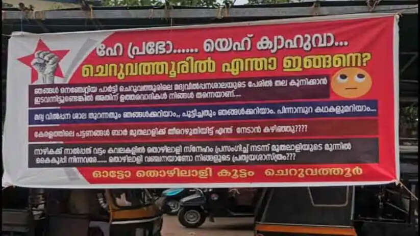 Banner | 'ഹേ പ്രഭോ യെ ക്യാ ഹുവാ, തൊഴിലാളി വഞ്ചനയാണോ നിങ്ങളുടെ പ്രത്യയ ശാസ്ത്രം; കാസർകോട്ടെ തോൽവിക്ക് പിന്നാലെ ചെറുവത്തൂരിൽ സിപിഎമിനെതിരെ ബാനർ