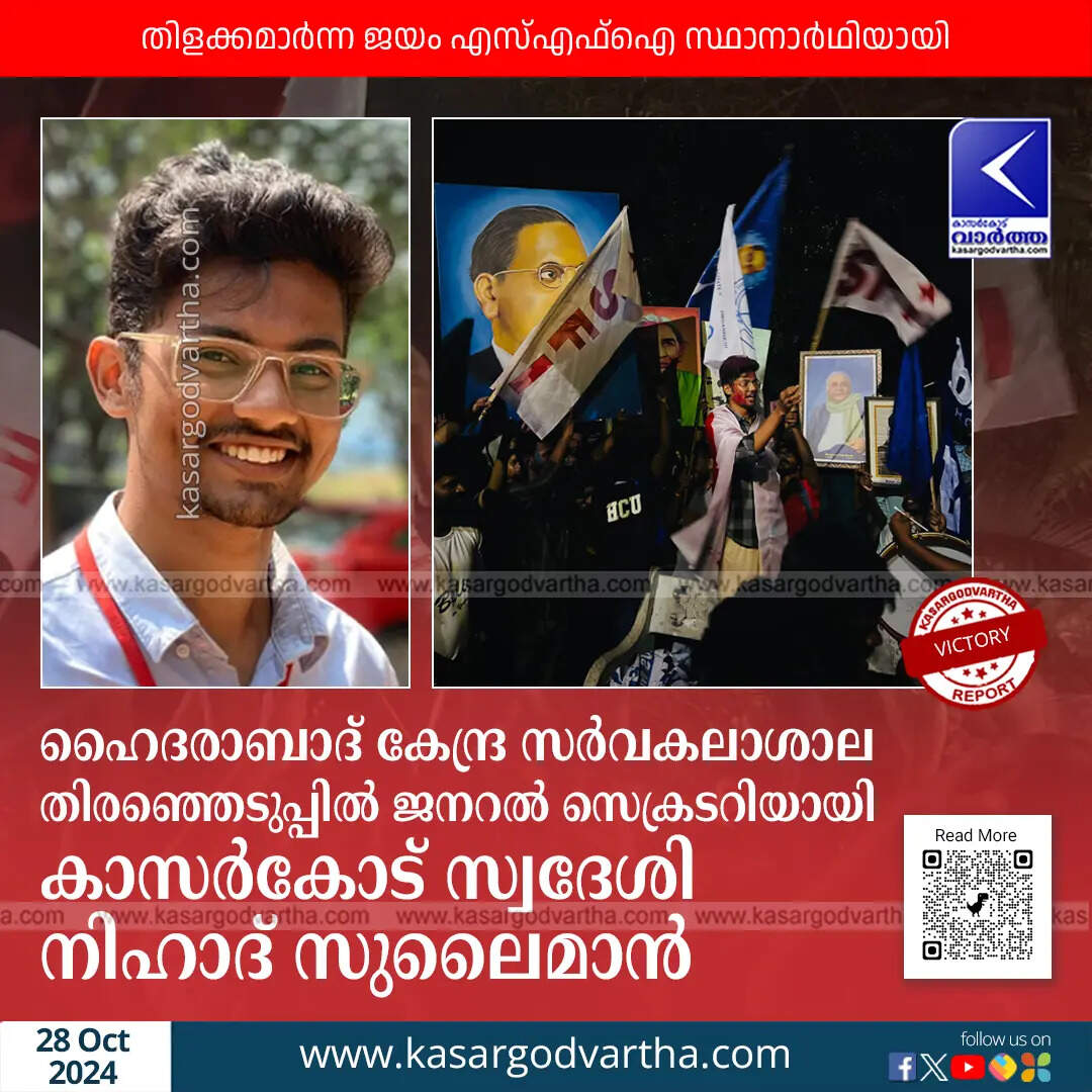 Victory | ഹൈദരാബാദ് കേന്ദ്ര സർവകലാശാല തിരഞ്ഞെടുപ്പിൽ ജനറൽ സെക്രടറിയായി കാസർകോട് സ്വദേശി നിഹാദ് സുലൈമാൻ; തിളക്കമാർന്ന ജയം എസ്എഫ്ഐ സ്ഥാനാർഥിയായി