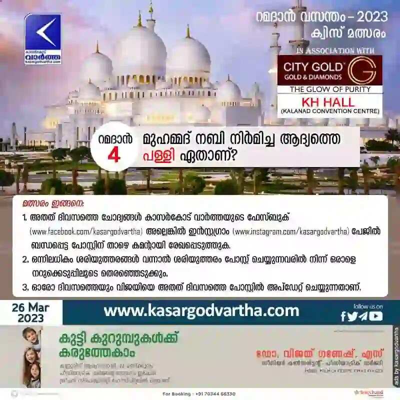 Keywords: Ramadan 2023, Kerala, Kasaragod, Kasargodvartha, Ramadan, Religion, Masjid, Muslims, Fast, Quiz, Competition, Prophet Muhammad (s), Day 4: First masjid built by Prophet Muhammad? 'Ramadan Vasantham 2023 - Kasargodvartha Quiz Competition.