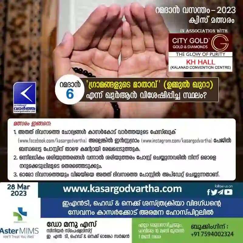 Keywords: Kerala, Kasaragod, Ramadan, Quiz, Competition, Religion, Muslims, Ummul Qura, Day 6: Which place is known as Ummul Qura? 'Ramadan Vasantham 2023 - Kasargodvartha Quiz Competition.