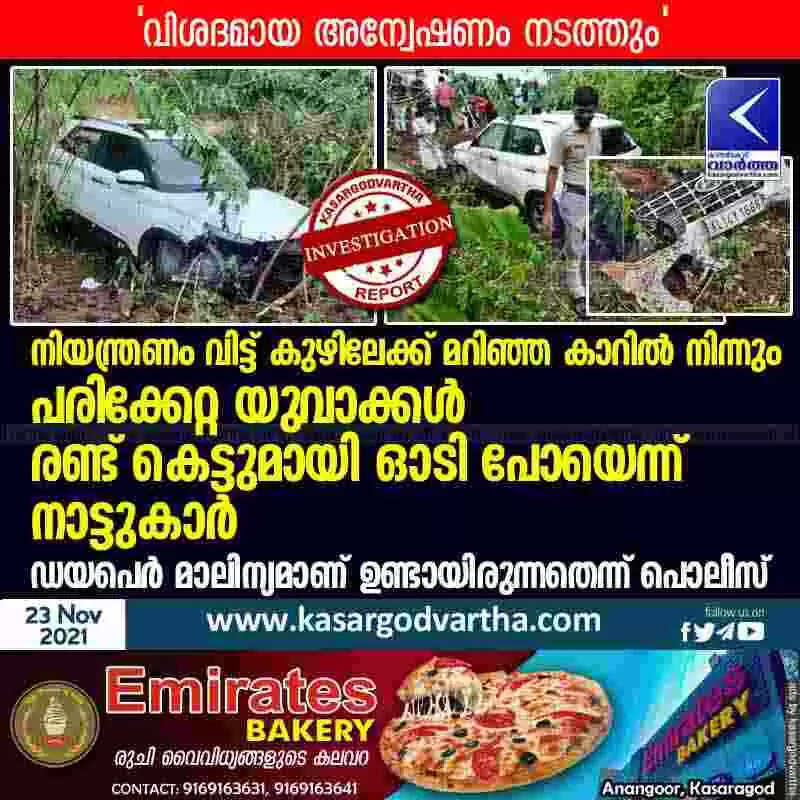ചെർക്കള: (www.kasargodvartha.com 23.11.2021) നിയന്ത്രണം വിട്ട് കുഴിലേക്ക് മറിഞ്ഞ കാറിൽ നിന്നും പരിക്കേറ്റ യുവാക്കൾ രണ്ട് കെട്ടുമായി ഓടി പോയെന്ന് നാട്ടുകാർ. കഴിഞ്ഞ ദിവസം വൈകീട്ട് ബദിയടുക്ക പൊലീസ് സ്റ്റേഷൻ പരിധിയിൽപെട്ട ചെർക്കള നെല്ലിക്കട്ടയിലാണ് അപകടമുണ്ടായത്. കാർ റോഡിൽ നിന്നും നിയന്ത്രണം നഷ്ടപ്പെട്ട് താഴെയുള്ള കുഴിയിലേക്ക് മറിയുകയായിരുന്നു.