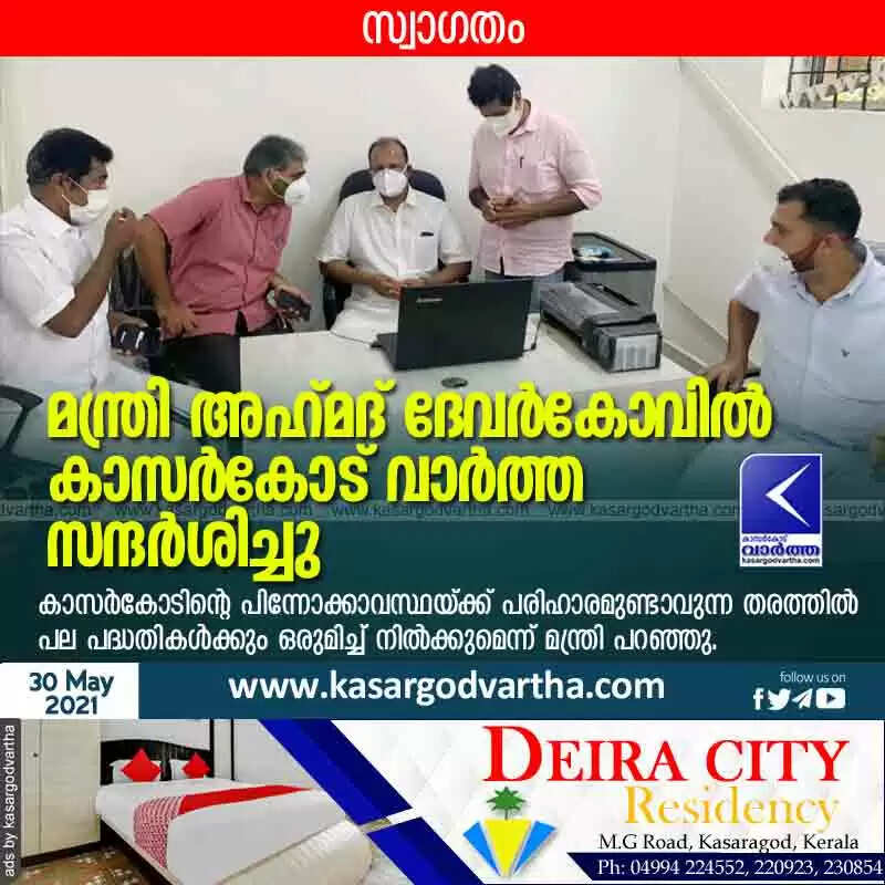 കാസർകോട്: (www.kasargodvartha.com 30.05.2021) മന്ത്രിയായ ശേഷം ആദ്യമായി ജില്ലയിലെത്തിയ തുറമുഖ പുരാവസ്തു വകുപ്പ് മന്ത്രി അഹ്മദ് ദേവർകോവിൽ കാസർകോട് വാർത്ത സന്ദർശിച്ചു. കാസർകോടിന്റെ പിന്നോക്കാവസ്ഥയ്ക്ക് പരിഹാരമുണ്ടാവുന്ന തരത്തിൽ പല പദ്ധതികൾക്കും ഒരുമിച്ച് നിൽക്കുമെന്ന് മന്ത്രി പറഞ്ഞു. കാസർകോട് ജില്ലയുടെ ചുമതല കൂടിയുള്ള മന്ത്രിയാണ് അഹ്മദ് ദേവർകോവിൽ.