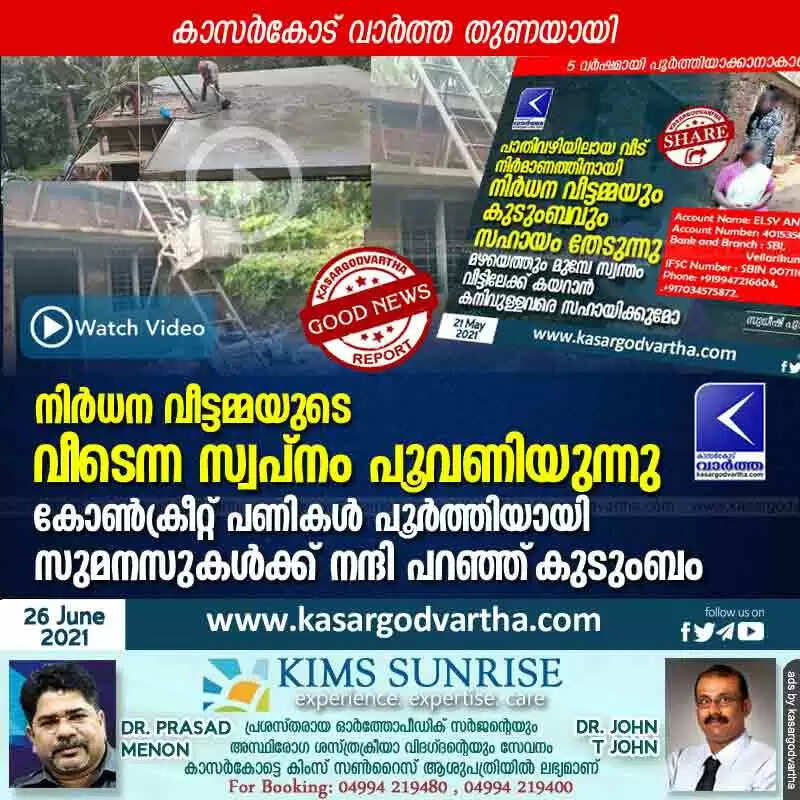 കാസർകോട് വാർത്ത തുണയായി; നിർധന വീട്ടമ്മയുടെ വീടെന്ന സ്വപ്‌നം പൂവണിയുന്നു; കോൺക്രീറ്റ് പണികൾ പൂർത്തിയായി; സുമനസുകൾക്ക് നന്ദി പറഞ്ഞ്‌ കുടുംബം